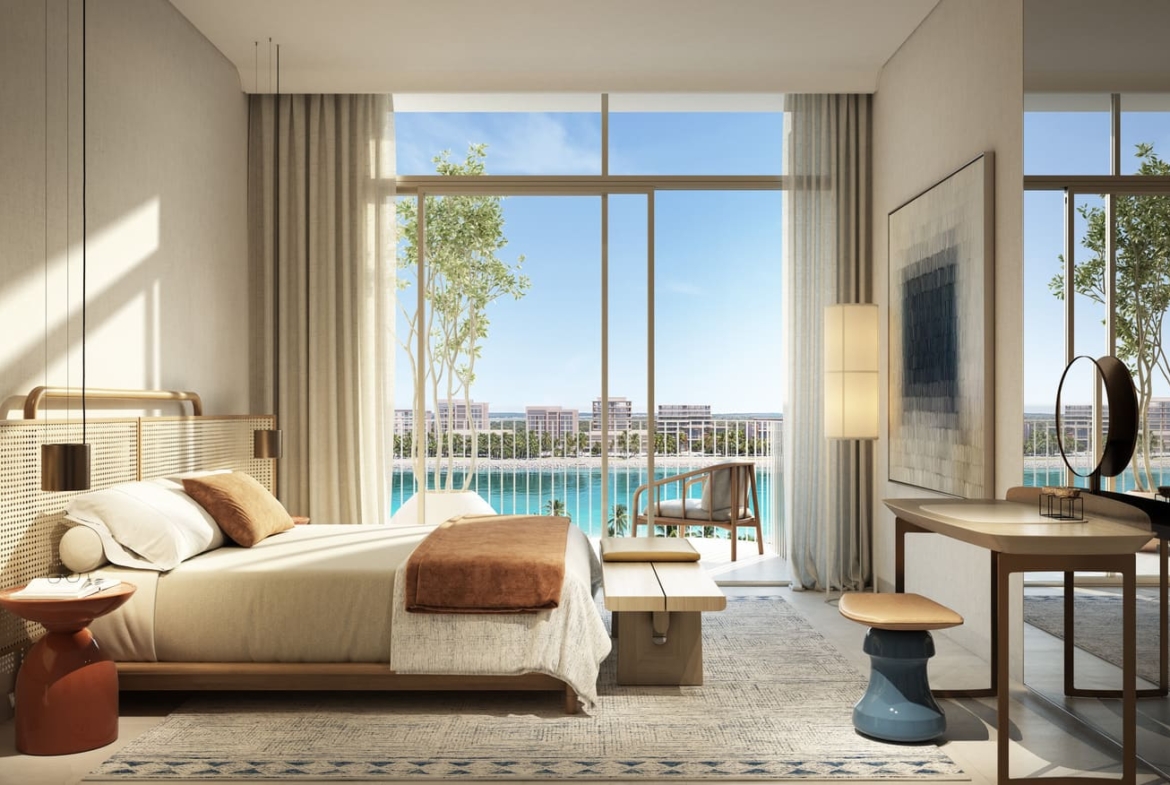 The residences include 1-, 2-, 3-, and 4-bedroom apartments, as well as an exclusive penthouse, all framed by expansive terraces and floor-to-ceiling windows. Elegant interiors showcase warm wood textures, light stone finishes, and soft, modern tones that reflect the serenity of island life. Building 15 stands as a centerpiece, offering premium 4-bedroom homes and private lobbies, while every unit is thoughtfully designed to blend privacy, comfort, and timeless style.