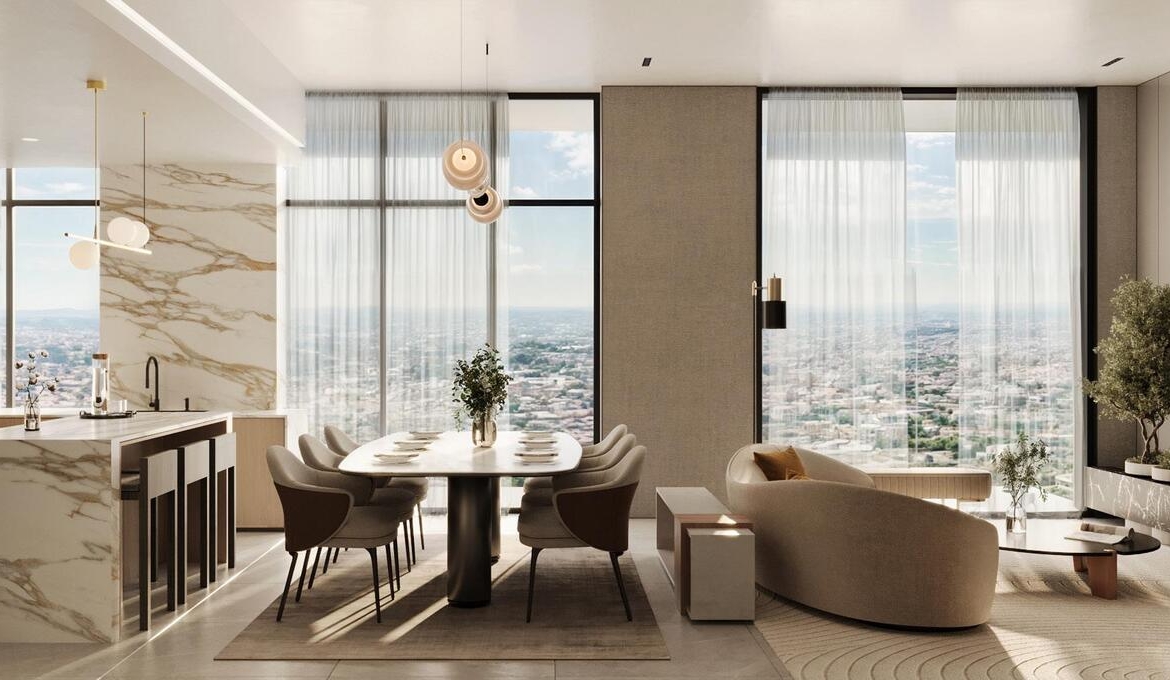 The development features residential units, offering a selection of 1-, 2-, and 3-bedroom apartments. Each home is crafted with a refined aesthetic, combining open layouts, light tones, and elegant finishes. Interiors blend functionality with comfort, highlighted by integrated living spaces, soft natural lighting, and high-end materials like marble and wood. Select apartments include study rooms, rooftop access, and design elements that emphasize both privacy and connection.