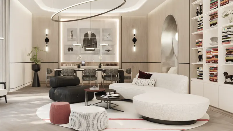 Designed with the ethos of Karl Lagerfeld’s fashion collections, the architectural form of the villas incorporates minimalistic and sleek lines, a monochromatic color palette, and textured materials, echoing the timeless aesthetic. Each villa features a central catwalk entrance, spiraling staircase, sunken lounge, library lounge, and dedicated Majlis room, creating an atmosphere of refined elegance.